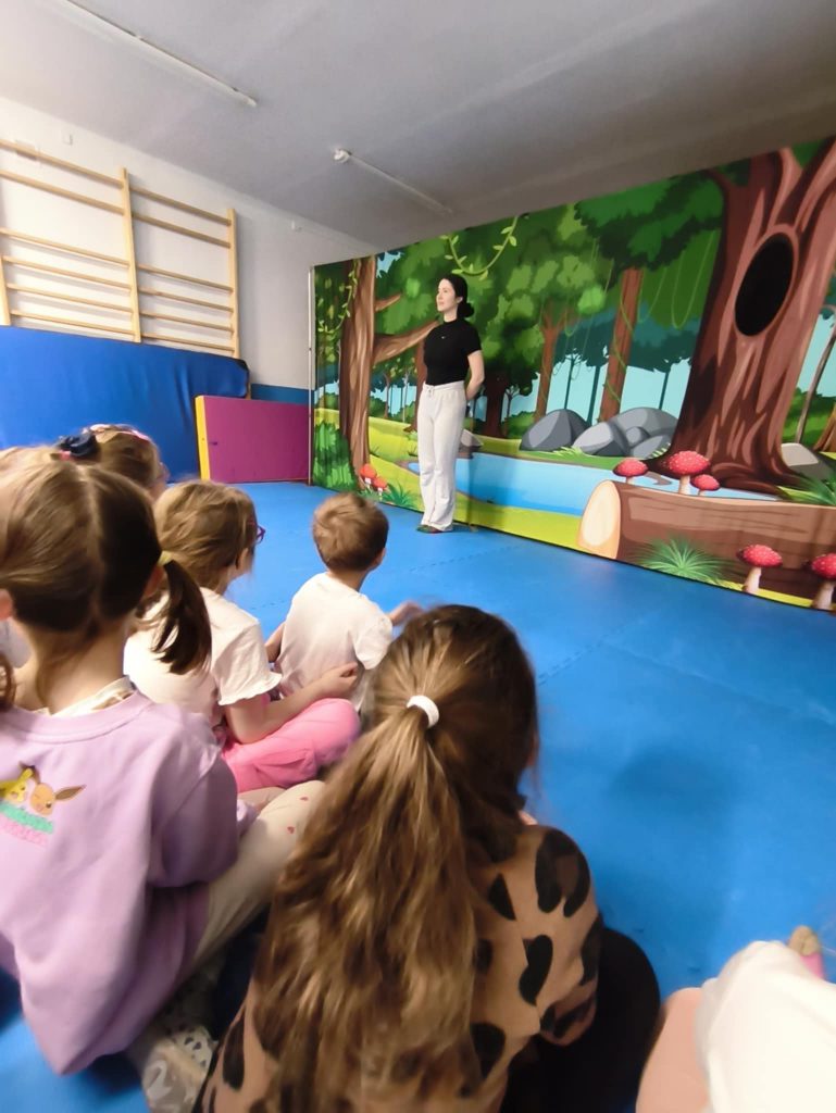 Dwie sale gimnastyczne znajdują się na poziomie -1, są bardzo dobrze wyposażona w sprzęt i pomoce do zabaw ruchowych i muzycznych.